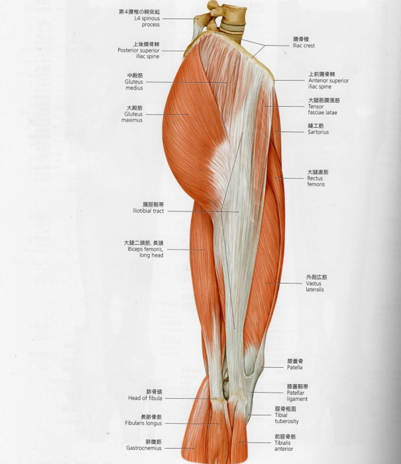 大腿筋膜張筋や大殿筋、中殿筋と連結しており、骨盤の外側から膝とを結び外側不安定性の制御を担っています。