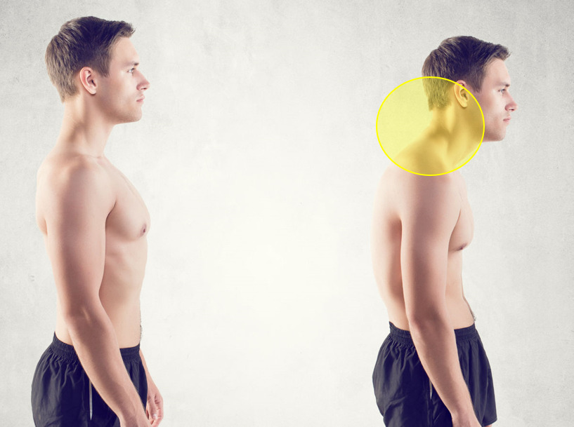 しかし、上図の右側の様な姿勢では、頭が前方へ出ることで、胸鎖乳突筋や肩甲挙筋、僧帽筋上部線維が常に働くことで頭部を支えています。