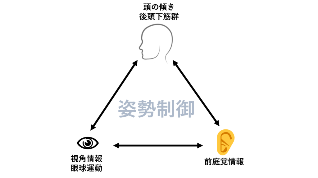 視覚(目)、前庭覚(耳)、体性感覚(筋肉や皮膚など)からの情報によって頭部が傾かないよう反射的に姿勢調整が行われます。