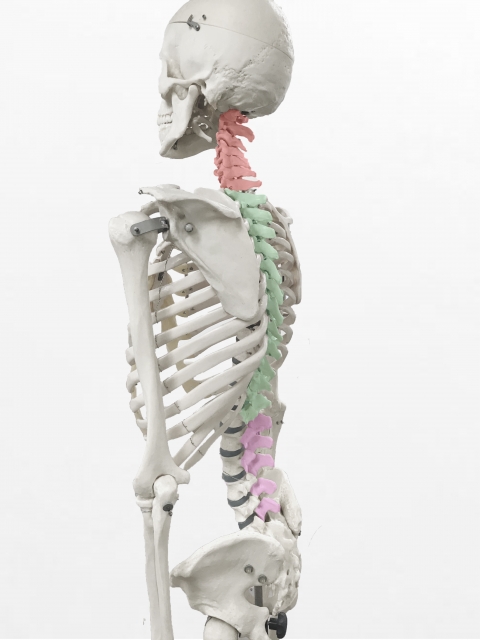 背骨はS字の彎曲をしており、上から頚椎、胸椎、腰椎の順番で3つに分けられます。