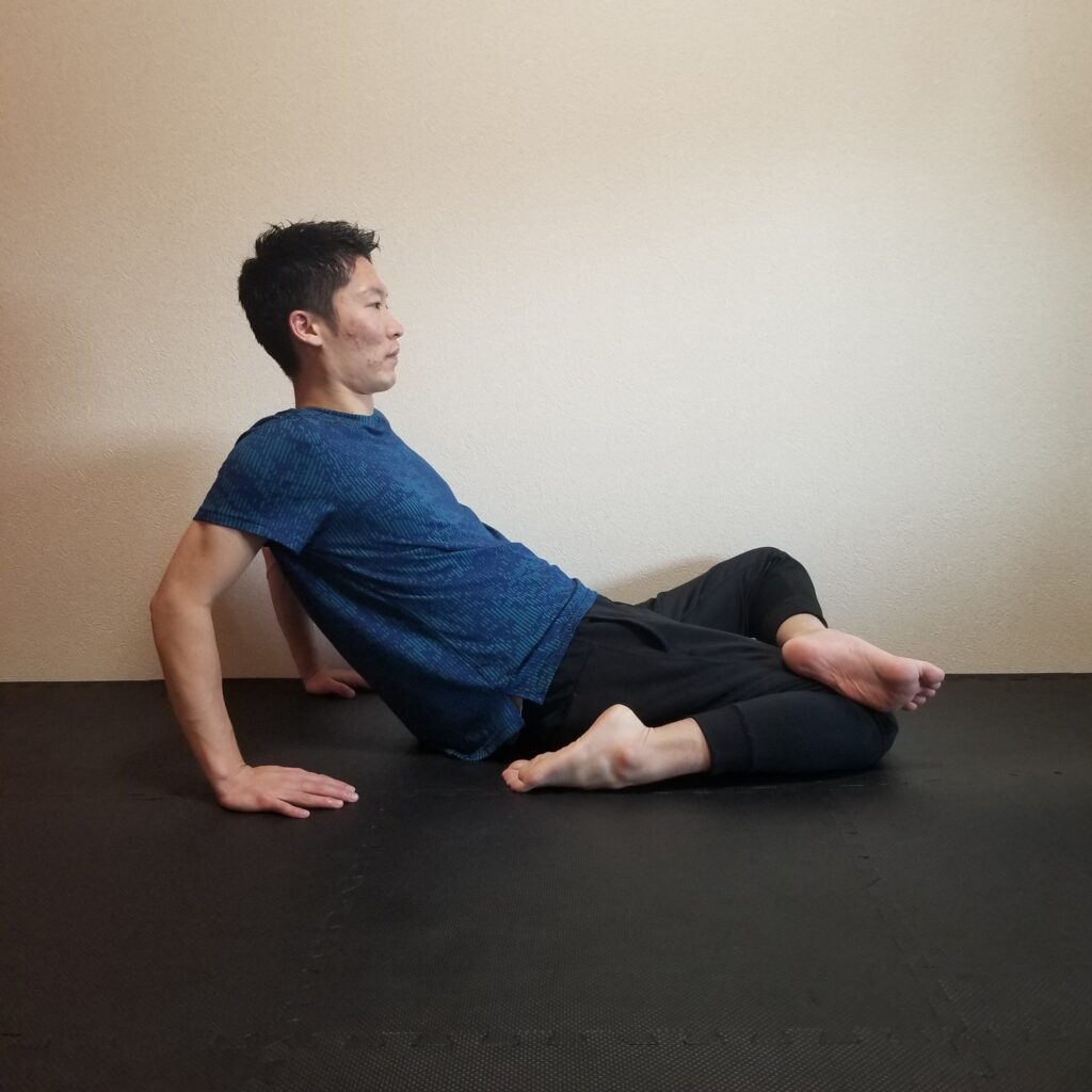 左脚を右膝の上に置くことで、ストレッチが強くかかります。