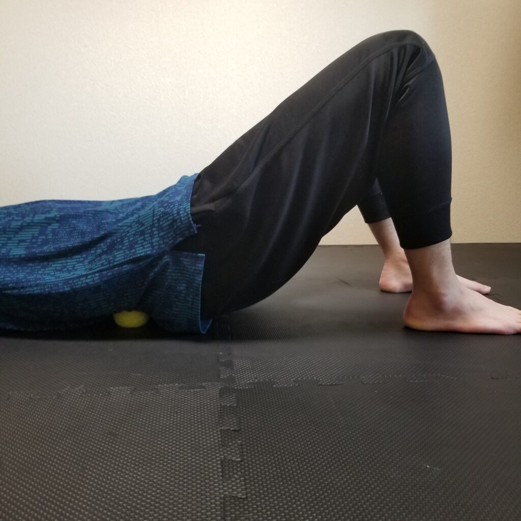 テニスボールを腰に当てることで、腰回りのマッサージを行います。